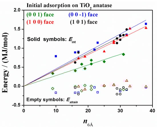 The initial interaction energy between HSA subdomain calculated on different crystallographic TiO2 surfaces (solid symbols) and the strain energy (empty symbols) plotted as a function of the number of amino acids in contact with the TiO2 anatase surface within 6 Å. These values are calculated for all the different initial geometries reported in Figure S1 considering all four TiO2 crystallographic anatase faces reported in Figure 1. Color code: in green, in blue, in red and in black, respectively, the values calculated for the (0 0 1), the (0 0 −1), the (1 0 0) and the (1 0 1) crystallographic surface. The common best-fit lines through the origin for the only Eint values are reported and given by Equations (1)–(4).