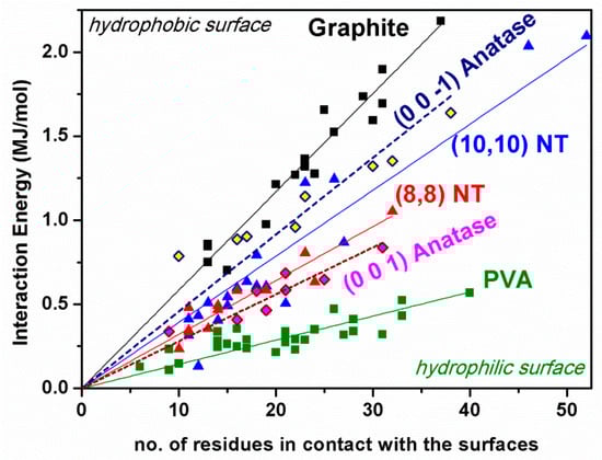 Taking into account the different starting orientations of the protein subdomain producing different optimized adsorption geometries corresponding to a local energy minimum, Eint turns out to be linearly correlated with the number of amino acids that are in contact with the surface as in previous work about the adsorption of the same HSA fragment on graphite [65,66], SWCNT [44], PVA surface [48]. n6Å is the number of amino acids in contact with the surface, where 6 Å is conveniently taken as the upper distance for a contact interaction as reported in previous work about the adsorption on TiO2 rutile, anatase and brookite [67]. The linear dependence, due to the additive nature of the attractive interactions, shown in Figure 2 together with the best-fitting lines through the origin, is given by:
