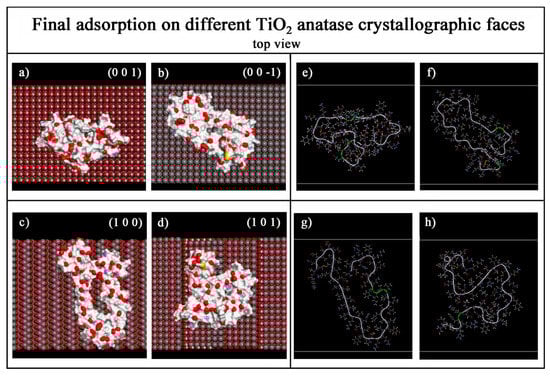 In Figure 2, the initial most stable optimized geometries after MM calculation for the four TiO2 anatase crystallographic surfaces are reported. In all geometries the secondary structure changes in order to maximize the interaction with the specific TiO2 solid surface. For all initial energy minima, the interaction energy, Eint, and the strain energy, Estrain, were calculated [65,66,67].