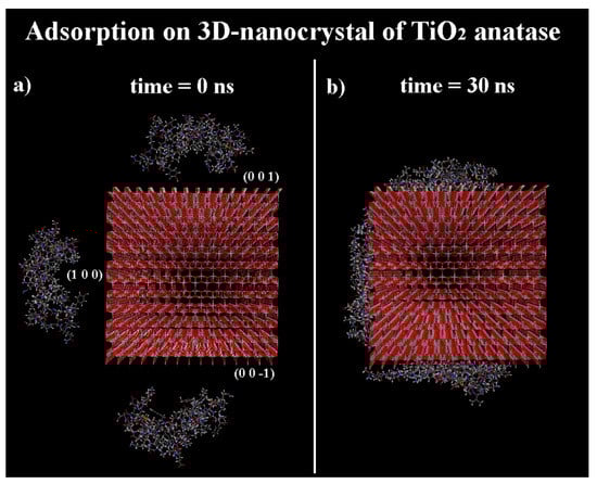 In this section, the competitive adsorption process of HSA A-subdomain in TiO2 anatase 3D nanocrystal just studied in a previous work [68] is described considering in particular three different crystallographic facets, namely, the TiO2 anatase (0 0 1) face, the (0 0 −1) face and four (1 0 0) faces (see Figure 7). These facets were simultaneously present considering the ideal TiO2 anatase 3D-nanocrystal, in order to better understand the competitive protein adsorption process. In previous work the adsorption process of molecules smaller than the albumin fragment was studied, such as quinoline molecules considered at small and at large concentration. The MM and MD methods have been demonstrated to be a very useful tool to distinguish the influence in the adsorption process of the chemical structure and topography exposed by the specific crystallographic surface. In panels (a,b) of Figure 7, the initial geometry and the final optimized geometry obtained after a MD run lasting 30 ns are reported, respectively.