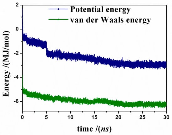 The potential energy and the van der Waals contribution calculated during the MD run are reported in Figure 8.