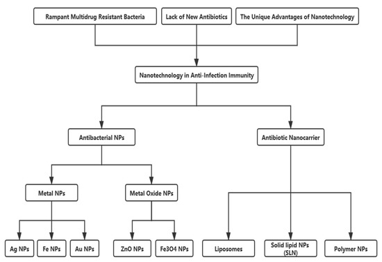While looking for new antimicrobial drugs, scientists envision the use of new techniques to modify the way antibiotics act, drug dosage forms, particle sizes, and so on to promote the bactericidal effect. Several types of antibacterial NPs and nano-antibiotic carriers have been shown to be effective in treating infectious diseases, including in drug-resistant ones, in vitro and in animal models [18]. The applications of nanotechnology in anti-infection immunity mainly include the direct bactericidal effect of some NPs [19]; the loading of antibiotics by nanocarriers, particularly in overcoming antibiotic-resistant pathogens, have been explored as a promising alternative to current antibiotic-based approaches [20].