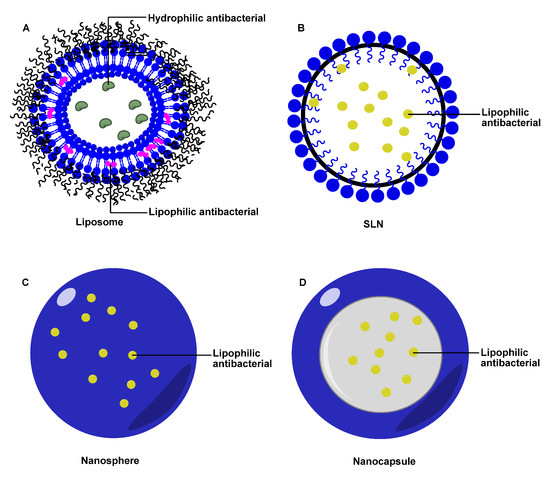 Commonly used antimicrobial delivery vectors: liposome (A), solid lipid NPs (SLN) (B), polymer NPs including nanosphere (C) and nanocapsule (D).