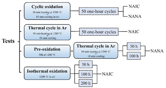 Cyclic oxidation tests of an NAIC sample and an NANA sample for 50 one-hour cycles were carried out in a vertical tube furnace equipped with an automation system to move the samples in and out of the furnace. Each cycle consisted of 50 min heating at 1200 °C, and 10 min forced air cooling outside the furnace. The argon gas thermal cycle tests for 50 and 100 one-hour cycles were conducted in the same vertical tube furnace and followed the same cyclic regime. The difference from the cyclic oxidation tests is that the samples cycled in argon were put into crucibles and sealed under argon atmosphere in silica ampoules, including two NANA specimens that had been subjected to isothermal exposure at 1200 °C for 50 h. Isothermal oxidation tests of three NAIC samples were performed at 1200 °C for 50, 100, and 200 h, respectively, in a tubular furnace (GSL-1600X, HF-Kejing, Hefei, China). A flowchart of the tests and specifications can be seen in Figure 1. After thermal cycling and isothermal testing, samples for microstructure characterization were nickel-plated, embedded in epoxy, ground, and finely polished using standard metallographic techniques.