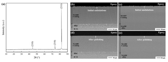 Figure 2. XRD pattern of the as-deposited β-NiAl coating (a) and cross-section morphologies: (b,c) as-annealed NiAlHf coating, (d,e) after polishing.