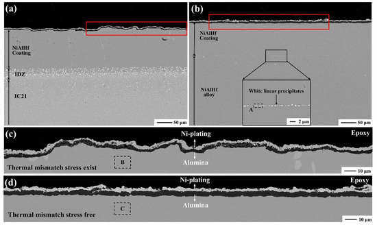 Figure 3 shows the cross-section morphologies of NAIC and NANA after 50 one-hour cycles in the air atmosphere at 1200 °C. As Figure 3a shows, the IDZ in the NAIC sample has reached a thickness of 37 μm. It is indicated that the interdiffusion behavior occurs between the NiAlHf coating and the IC21 substrate during cyclic oxidation. In Figure 3b, some white linear precipitates appeared at the coating/substrate interface. The EDS results show that they are Hf-rich phases (Table 2). For the higher magnification of the NAIC and the NANA samples shown in Figure 3c,d, the oxide scale is exclusively Al2O3 without spinel because the β-phase is Al-rich, while Hf as a reactive element in the coating can slow the oxidation rate and provide a strong interfacial bonding at the scale-coating interface. It can be noted from Figure 3c that the surface of NAIC appears rumpled with a maximum amplitude of 15 μm. In contrast, the NANA surface is flat and straight in Figure 3d. The different surface states in Figure 3c,d indicate that the rumpling behavior after cyclic oxidation is indeed associated with the substrates. The two aspects are considered to explain the results, as follows.