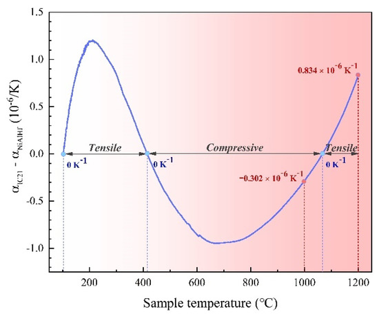 where a C and a M are the CTE of the coating and matrix, respectively, E C represents the coating elastic modulus, ΔT is the temperature difference and ν C denotes the Poisson’s ratio in the coating. According to Equation (2), the plus or minus, namely the direction of the thermal stress σ C , is determined by the difference in the CTE between the IC21 superalloy and NiAlHf alloy ( a IC 21 a NiAlHf ) . Figure 4 shows ( a IC 21 a NiAlHf ) as a function of temperature from room temperature to 1200 °C. It can be seen from Figure 4 that three temperatures at 102, 415, and 1067 °C corresponding to the value of ( a IC 21 a NiAlHf ) are zero. Thus, the stress σ C is tensile at the initial heating stage, then becoming compressive between 415 °C and 1067 °C and finally returning to tensile stress when the temperature exceeds 1067 °C. For the heating process of NAIC from 1000 to 1200 °C, the value of ( a IC 21 a NiAlHf ) shown in Figure 4 varies from −3.02 × 10−5 to 8.34 × 10−5 K−1. Thus, for the coating with an elastic of 155 GPa and a Poisson’s ratio of 0.35 [26,27], the mismatch stress σ C calculated by Equation (2) is from about −68.4 to 228.6 MPa during the temperature variation. It should be mentioned that the yield stress of the coating measured at 970 °C is about 25 MPa [28], which is lower at a higher temperature. Undoubtedly, both the compressive mismatch stress and tensile mismatch stress exceeded the yield stress of the coating during the heating process from 1000 to 1200 °C, at which point the plastic deformation of the coating occurs, while the NANA samples whose coating and substrate share the same material (NiAlHf) have the same thermal expansion coefficient. Thus, both the value of ( a M a C ) and σ C is 0, indicating that no thermal mismatch stresses exist between the coating and the substrate. Therefore, it is reasonable to speculate that no rumpling behavior occurs after cyclic oxidation. The analysis mentioned above sheds light on the relationship between surface rumpling and the thermal expansion coefficient, which is highly consistent with the experiment results in Figure 3.