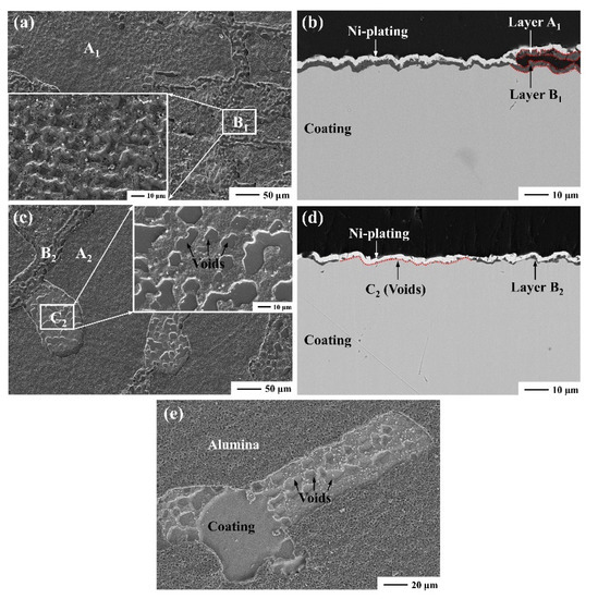 Figure 7a shows the surface morphology of the NANA sample upon 50 one-hour thermal cycles at 1200 °C. The flat zone labeled as A1 and rumpled zone labeled as B1 were proved to be oxide scale by EDS results in Table 3. Figure 7b shows the cross-section morphology of the NANA sample. By comparing Figure 7a,b, the oxide scale shows a duplex structure with outer layer A1 and inner layer B1. As Figure 7b shows, layer A1 is relatively flat and straight, while layer B1 exhibits quite obvious undulations, showing a group of sinusoidal periodic undulations of oxide scale. The surface and cross-section morphologies indicate that layer B1 has strong interfacial bonding with the coating, which guarantees the combined deformation as the coating deforms. Meanwhile, the unevenness of layer B1 reduces the contact area with layer A1, thus contributing to the spallation of layer A1.