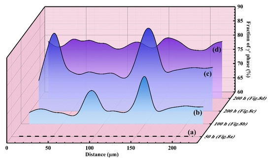 Figure 9. Waterfall plot graphic of the fraction of γ’ phase after 50 h (a), 100 h (b) and 200 h (c,d) isothermal oxidation at 1200 °C.