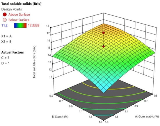 Total soluble solids (°Brix) = 15.37778 − 2.02222A + 2.78889B + 1.17778C + 0.95AC − 1.56667A2 − 2.31667B2 − 0.366667C2.