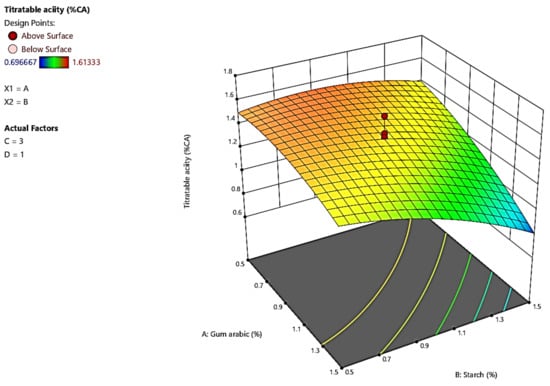 Titratable acidity (% CA) = 0.954444 + 0.356944A + 0.831111B + 0.152778C − 0.441667AB + 0.104167AC − 0.30A2 − 0.353333B2 − 0.0433333C2.
