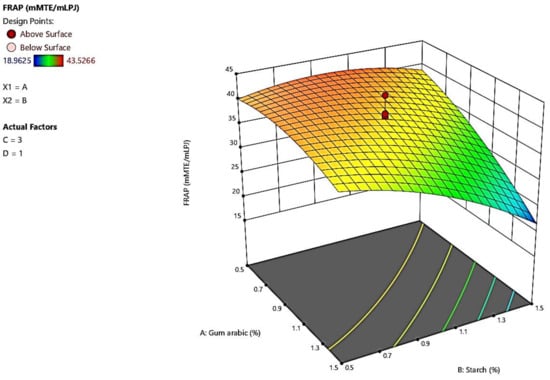 Table 3 and Table 4 show the regression coefficients from RSM analysis and experimental data for response variables including the FRAP of PJ, respectively. The Model F-value was 50.50, implying that the model was significant (p < 0.05) and all model terms (A, B, AB, AC, A2, B2, C2) were significant (p < 0.05) with values less than 0.1. The “Lack of Fit” F-value of 0.26 denoted that the “Lack of Fit” for the model was not significant relative to the pure error. The Predicted R2 of 0.9095 agreed with the Adjusted R2 of 0.9318 (difference < 0.2). The ‘Adeq Precision’ for the model was 20.034, indicating an adequate signal for the model to navigate the design space. Similar to Figure 4, the 3D surface plot (Figure 6) showed that change in MS concentration imposed a greater effect on FRAP of PJ compared to GA. The results showed that MS concentration was negatively related to FRAP values like observation for RSA. The mathematical equation in terms of actual factors for FRAP is indicated in Equation (8):