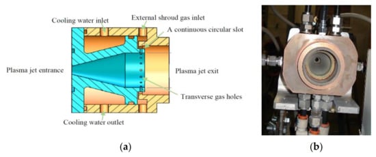 - Thomson, I.; Pershin, V.; Mostaghimi, J.; Chandra, S. Experimental testing of a curvilinear gas shroud nozzle for improved plasma spraying. Plasma Chem. Plasma Process. 2001, 21, 65–82. [Google Scholar] [CrossRef]