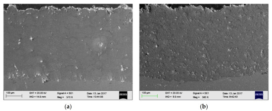 The SEM images of the polished cross sections of the titanium coatings at low magnification are shown in Figure 3. It indicates from those images that the plasma sprayed titanium coating with the shroud is much denser in the microstructure and has a low porosity, while the atmospheric plasma-sprayed titanium coating without the shroud holds a relatively high porosity.