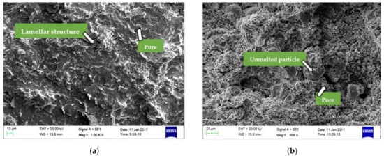 The SEM images of the fractured cross-section for the plasma-sprayed titanium coatings are presented in Figure 4. The titanium coating plasma sprayed with the shroud presents a lamellar structure, as noticed in Figure 3a. Those tiny splats are closely compacted within the coating and make a dense microstructure. There were no unmelted particles found in the shrouded plasma-sprayed titanium coatings. A small number of voids can be observed. The unshrouded titanium coating in Figure 3b shows a different microstructure. The loose microstructure is apparent, and the lamellar structure is not clearly apparent in the unshrouded titanium coating; whereas some un-melted titanium particles with a few of pores imply that the molten state of the titanium splats in-flight in the plasma jet was not well achieved.