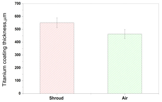 Titanium coatings were deposited onto the mild steel substrates with or without the shroud attachment by using the same spraying parameters. Coating thicknesses were measured by using the optical microscope and averaged from 10 measurements per sample. The thickness of titanium coating without a shroud is 463 ± 35 μm, and that for the shrouded titanium coatings is increased to 551 ± 38 μm, as shown in Figure 6.