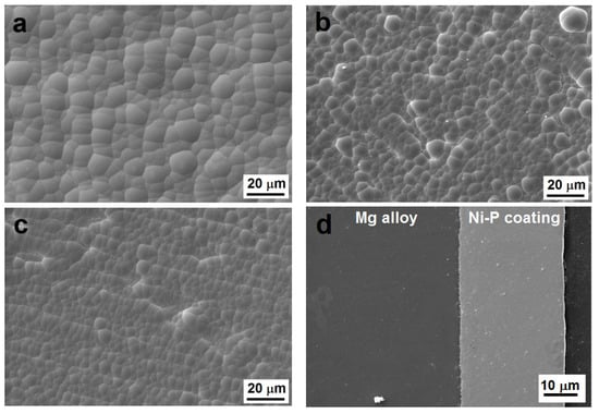 The surface morphology of Ni-P coatings deposited on AZ91 magnesium alloy is shown in Figure 1. The deposited Ni-P coatings had high—(10.8 ± 0.1 wt. % of P), medium—(7.4 ± 0.1 wt. % of P), and low—(5.5 ± 0.1 wt. % of P) phosphorus contents. All deposited coatings show a nodular morphology, which is typical for electroless Ni-P coatings [12]. As observed in Figure 1a–c, the nodule size decreases with increasing P content. As reported by Shu [26], the phosphorus has very low solubility in nickel; therefore, the reduced phosphorus tends to aggregate at the boundaries of the nickel grains during deposition. Hence, the phosphorus inhibits the growth of Ni particles and particles of Ni-P and increases the number of nucleation sites. The same dependence of nodule size on phosphorus content was also observed by Ashtiani et al. [10]. Some structural defects and associated cracks were rarely observed in MP Ni-P coatings. These microstructural defects (growths, micropores, microcracks) increased the roughness and worsened the corrosion resistance of MP Ni-P coatings.