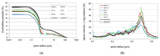 Figure 3a, the results of the porosimetry measurements are shown. In this method, there might be a significant scatter between the different measurements of the same coating. Therefore, an estimation of the amount of scattering was obtained by performing two measurements (named as a and b) for each type of coating. According to the results, the difference between the two measurements was always below 1%. The lowest porosity was observed for the coating which was electrochemically removed. The next highest porosity level was measured for the NaCl and then the HCl method. The highest pore volume was detected in the coating prepared via the graphite method. This result can be explained by the higher roughness of the coating in the graphite method, which can be noticed in