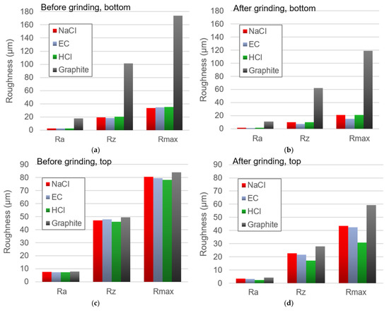 max of the as-sprayed coatings after the removal of the substrate as well as after the grinding process prior to the three-point bending test. It can be seen that the effect of the rough surface of the graphite substrate was diminished at the top surface compared to the bottom surface. Furthermore, the grinding could reduce the roughness for all coatings, however, the samples sprayed on graphite remained always rougher than the other samples. Obviously, it was not possible to remove all the extended roughness peaks of the graphite substrate by slight grinding. An interesting result was the large reduction in the roughness values of the top surface of the HCl-treated sample after grinding. Starting from roughness values which are comparable to the particle size of the spray powder (D10/D50/D90 = 21/53/95 µm), roughness values dropped significantly after grinding suggesting that parts and probably complete splats were removed by the grinding process. The HCl is expected to dissolve some of the necks between splats and hence reduce their bonding within the coating. As their bonding is reduced, the grinding might then be able to remove more easily the obstacles and features leading to a reduced roughness.