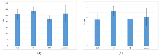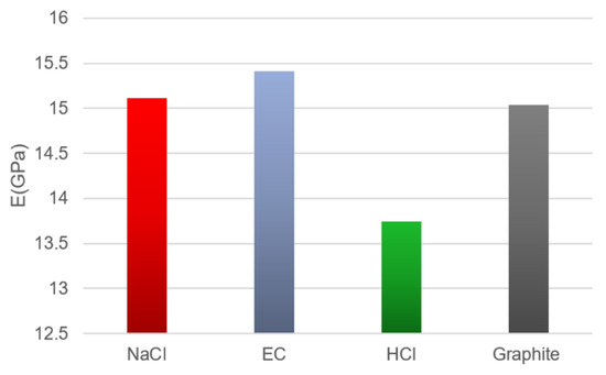 Figure 3), the EC sample with the lowest porosity showed the highest Young’s modulus. The other samples did not show too much difference in the porosity level (at least if the amount of porosity stemming from the surface roughness for the graphite sample is subtracted (~1%) or directly