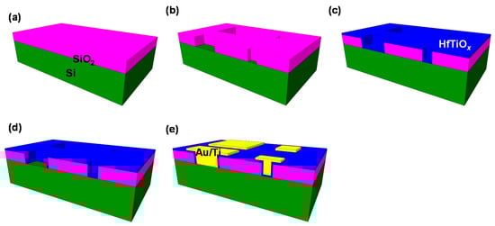 Fabrication process of Au/Ti/HfTiOx/p-Si device in contact hole structure: (a) SiO2 deposition as mold layer; (b) etching process after patterning; (c) HfTiOx layer deposition; (d) etching process of bottom electrode; (e) Au/Ti deposition into contact hole.