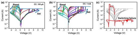 The 5 nm thick Ti layer in the Au/Ti/HfTiOx/p-Si device can act as a scavenger of oxygen. Ti is easily oxidized, bringing oxygen to the layer of HfTiOx and leading to oxygen vacancies at the HfTiOx layer. Figure 2a,b show the I-V curve of the Au/Ti/HfTiOx/p-Si device. The set and reset processes are observed in DC sweep mode under different compliance current (CC) conditions of 100 μA and 1 mA. The set process was performed at a positive voltage while the reset process was performed at a negative voltage. The LRS variation occurred due to the current overshoot during the set process. The conducting filament growth was not perfectly controlled even though the same CC was applied to the device. On the other hand, the HRS variation was of a stochastic nature when the filament ruptured. The current dropped abruptly under switching and the final HRS was reached in several steps under other switching. The resistive switching failure is depicted in Figure 2c. The full reset of the device happened when the current overshoot occurred with a negative bias. The conducting filament can be fully ruptured when strong Joule heating occurs [33]. It is difficult to conduct the set process again after the full reset occurs.