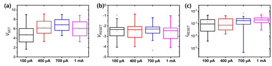 Figure 3a,b show the set voltage (VSET) and reset voltage (VRESET) distributions of Au/Ti/HfTiOx/p-Si device as a function of CC. VSET and VRESET are not particularly affected by CC. However, the reset current (IRESET) is slightly increased with increasing CC, indicating that in general a larger conducting filament is formed at a larger CC.