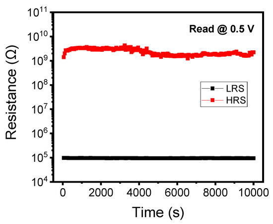 Retention test of Au/Ti/HfTiOx/p-Si device in the low-resistance state (LRS) and high-resistance state (HRS) for 10,000 s.