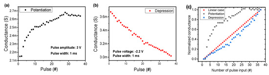 Next, the potentiation and depression were conducted in the Au/Ti/HfTiOx/p-Si device by applying repetitive pulses. For the potentiation, 36 consecutive pulses with an amplitude of 3 V were applied to the device in Figure 6a. The conductance was extracted by the read pulse with 0.5 V after each pulse for potentiation or depression in Figure 6a,b. Although the conductance decreases or maintains at a few points, in most cases, the conductance value gradually increased with repeated pulses. Similarly, for the depression, the 36 consecutive pulses with a pulse voltage of −2.2 V decreased the conductance linearly. Of the 36 pulse responses, only four cases show the opposite tendency and others were all decreased with pulses. To evaluate the linear update of the conductance in the potentiation and depression, nonlinearity (NL) is defined by the formula NL = average (|(G − Glinear)/G| × 100), where G is the conductance value and Glinear is the conductance of the ideal case. The NLs of potentiation and depression are 29.25% and 7.29%, respectively, in Figure 6c.