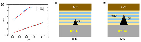(a) ln(I) versus V1/2 fitting curve of Au/Ti/HfTiOx/p-Si device in the LRS and HRS. (b) Filament evolution and gap region between Au/Ti and filament in (b) HRS and (c) LRS.