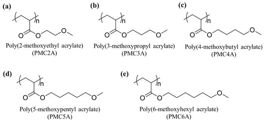 Chemical structures of poly(ω-methoxyalkyl acrylates) (PMCxAs): (a) poly(2-methoxyethyl acrylate) (PMC2A); (b) poly(3-methoxypropyl acrylate) (PMC3A); (c) poly(4-methoxybutyl acrylate) (PMC4A); (d) poly(5-methoxypentyl acrylate) (PMC5A); (e) poly(6-methoxyhexyl acrylate) (PMC6A).
