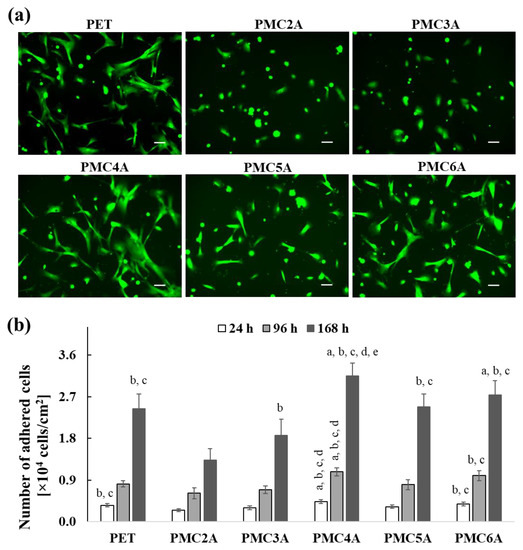 (a) Calcein staining images for NHDFs adhered on PET, PMC2A, PMC3A, PMC4A, PMC5A, and PMC6A after 24 h of incubation (scale bars = 100 µm). (b) The number of adhered NHDF on PMCxA-coated substrates at 24, 96, and 168 h. The data represent the mean ± SD (n = 3, a p < 0.05 compared with PET, b p < 0.05 compared with PMC2A, c p < 0.05 compared with PMC3A, d p < 0.05 compared with PMC5A, e p < 0.05 compared with PMC6A; Tukey’s multiple comparisons test).