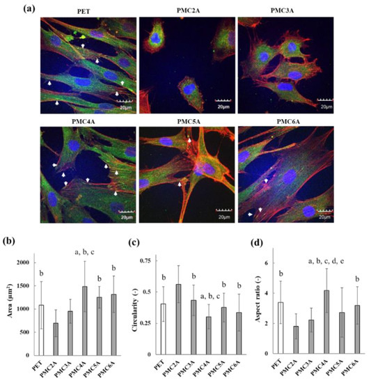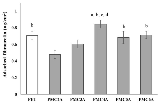 Evaluation of adsorbed fibronectin on substrates coated with PMCxAs. The data represent the mean ± SD (n = 15, a p < 0.05 compared with PET, b p < 0.05 compared with PMC2A, c p < 0.05 compared with PMC3A, d p < 0.05 compared with PMC5A; Tukey’s multiple comparisons test).