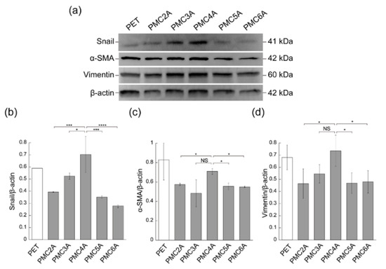 (a) Immunoblotting analysis for Snail, α-SMA, vimentin, and β-actin in NHDF cultured on PET, PMC2A, PMC3A, PMC4A, PMC5A, and PMC6A. (b–d) The band intensity for (b) Snail/β-actin, (c) α-SMA/β-actin, and (d) vimentin/β-actin (n = 3, * p < 0.05, *** p < 0.001, **** p < 0.0001; Tukey’s multiple comparisons test).