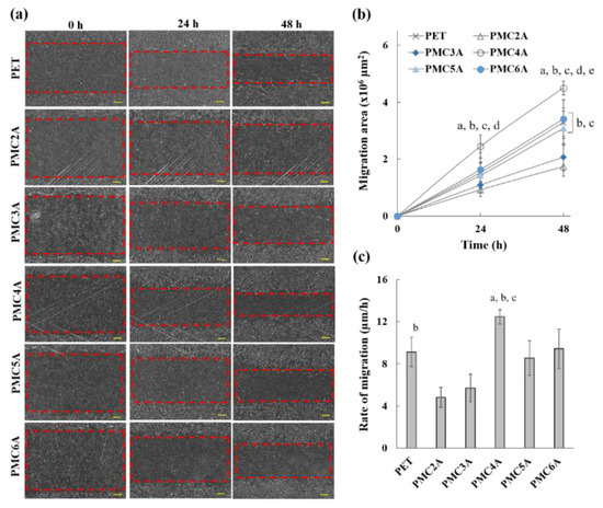 The modulation of fibroblast-to-myofibroblast differentiation and fibroblast migration is essential for the development of wound dressing materials [51]. Cell migration is the directionality of cells migrating toward the wounded area. To evaluate whether PMCxA substrates could be utilized in wound healing, a migration test was performed using the scratch procedure. The migration of NHDFs, migration area, and healing rate in the wound region are shown in Figure 6a–c, respectively. Figure 6a shows that the area of the scratch was significant at 0 h, while the region decreased from 0 to 24 and 48 h. The migration area was found to increase over time (Figure 6b), which implies the migration of cells towards the wound via autocrine or paracrine mechanisms [51]. Figure 6c also shows that the migration rate of cells on the substrate coated with PMC2A (4.81 μm/h; slope from Figure 6b and PMC3A (5.72 μm/h) was lower than that on the other substrates. It is crucial that the cells on PMC4A substrates migrate rapidly to the scratched area, resulting in a rapid decline in the area (12.47 μm/h). For PMC5A- and PMC6A-coated substrates, cells also migrated to the scratched area. Although the migration rate was lower than that on PMC4A, the differences were not significant compared with those on PET and other substrates. The fibroblast-to-myofibroblast differentiation is attributed to the expression of a phenotypic marker of myofibroblasts and the increase in the migration of cells [49,50]. Therefore, it suggested that the increase in the migration of NHDFs on PMC4A was accompanied by the fibroblast-to-myofibroblast differentiation, whereas PMC2A suppressed the migration of NHDFs and the differentiation.