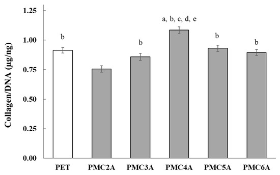 Total soluble collagen production by NHDFs on PMCxA substrates. The data represent the mean ± SD (n = 5, a p < 0.05 compared with PET, b p < 0.05 compared with PMC2A, c p < 0.05 compared with PMC3A, d p < 0.05 compared with PMC5A, e p < 0.05 compared with PMC6A; Tukey’s multiple comparisons test).