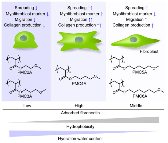 In the present study, we revealed that PMC4A enhanced fibroblast-to-myofibroblast differentiation, cell migration, and collagen synthesis and secretion in adhered NHDFs, while PMC2A suppressed these functions in the cells. PMCxAs were polymers whose properties, such as hydrophobicity, Tg, and hydration water content, were modulated systematically with the change in the number of methylene carbons on the side chain. Several studies have reported that cell migration, proliferation, and differentiation are influenced by physicochemical properties such as stiffness and hydration water content on the substrates. Engler et al. demonstrated that mesenchymal stem cells migrated to stiffer regions on hydrogels with different degrees of stiffness, known as durotaxis [53,54]. Han et al. reported that vascular smooth muscle cells were perceived to migrate towards the low hydration side of poly(sodium 4-styrenesulfonate)/poly(diallyl dimethylammonium) chloride multilayers with swelling differences [55]. Evans et al. reported that cells can sense underlying stiff material through a soft layer at low (<10 µm) thickness [56]. Because the thickness of the PMEA derivative polymer-coated layer, which was coated by almost the same procedure as used in the present study on the PET substrates and was determined to be around 80 nm, the effect of stiffness attributed to the PMCxA layer would not be predominant, but that of PET was [57]. Therefore, hydration water content, hydrophobicity, and mobility of PMCxAs might affect the NHDFs’ behavior. We summarized the behavior of NHDFs adhered to the PMCxAs as shown in Figure 8. By changing the number of methylene carbons, PMCxAs-coating modulated the amount of adsorbed fibronectin, hydrophobicity, and hydration water content on the substrates, leading to the change in NHDFs’ behavior. However, the cell behavior did not change with the increasing number of methylene carbons of PMCxAs, resulting in PMC4A bearing the intermediate properties among PMCxAs’ significantly activated fibroblast behavior. Therefore, it suggested that there was an optimal value of parameters of polymer to activate the cells. The detailed mechanism of activation of cells by PMCxAs requires further investigation.