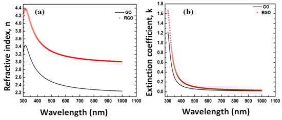 Estimated index of refraction (a) and extinction coefficient (b) of GO (black lines) and RGO (red lines) samples. Reprinted from Ref. [39] with permission from AIP Publishing. Copyright 2016 AIP Publishing.