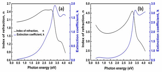 Figure 1a,b shows the optical constants dispersion curves in the (300–1000) nm wavelength range.