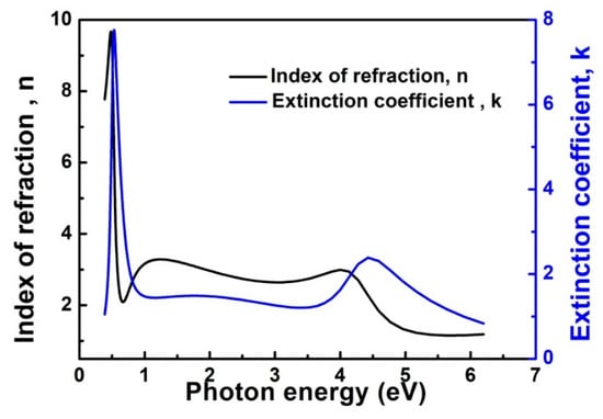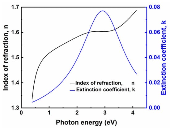 In Figure 6, the optical constants dispersion curves are reported in the (190–900) nm wavelength range.