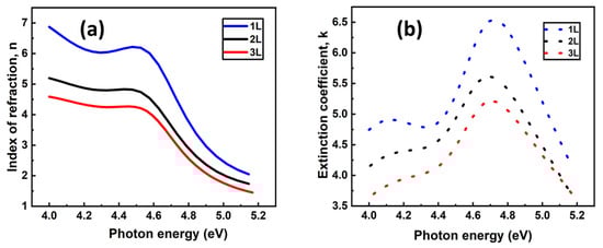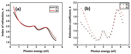 Estimated index of refraction (a) and extinction coefficient (b) of CVD-grown monolayer (blue lines), bilayer (black lines) and trilayer graphene (red lines) on PET substrates by VASE characterization. Reprinted from Ref. [33] with permission from Elsevier. Copyright 2020 Elsevier.