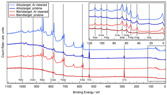 X-ray photoelectron spectroscopy survey spectra obtained for the two sputter targets before and after Ar bombardment. The inset shows a zoom-in of the binding energy range up to , which is densely populated by the 3s and 3p core level signals of the involved metals.