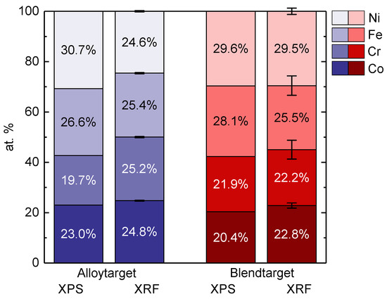Stoichiometric composition of the Alloytarget and Blendtarget derived from X-ray photoelectron spectroscopy (XPS) and X-ray fluorescence (XRF). The error bars for the latter represent the standard deviation of different measurement positions.