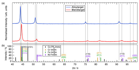 X-ray diffraction data for the Alloytarget (blue) and the Blendtarget (red) (a) and expected signals for powder diffraction of pure Co, Cr, Fe and Ni (b). The height of the bars represents the expected intensity relative to the most intense signal. Diffraction planes with a corresponding signal in one of the diffraction pattern (vertical lines) are labelled accordingly.