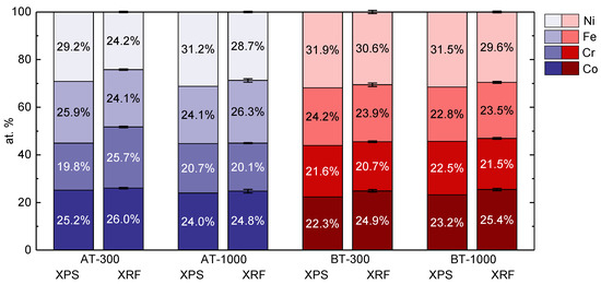 We now discuss the properties of the thin films prepared by sputtering using the two different targets. The compositions of four HEA films were determined in the same way as described for the sputtering targets, and the results are presented in Figure 5. For the XPS measurements, the films on EN 1.4404 stainless-steel substrate were investigated, whereas for XRF, the samples with Si(100) substrates were measured. Overall, the two methods used show a good agreement regarding the atomic concentration of the elements, as was the case for the sputter targets. With the exception of the Ni and Cr content of AT-300, the differences between XPS and XRF results is not more than for all elements. As a general trend, the Ni content is in the range of for all measurements, which is slightly higher than desired. With a similar difference from the desired value of , the concentration of Cr is lowered to approximately . These trends were also observed for both sputter targets as discussed above. This indicates that the composition of the thin films grown by magnetron sputtering under the conditions used in this study is determined by the stoichiometry of the sputter targets and not by the sputtering process. This means that differences in the composition of the films cannot be explained with different sputter rates of the elements, which is the highest for Cr, almost equal for Ni and Fe and the least for Co [25]. If there were a significant influence of the sputter rates on the composition of the films, the Cr content would be expected to be the highest and the Ni to Fe ratio should be almost 1.