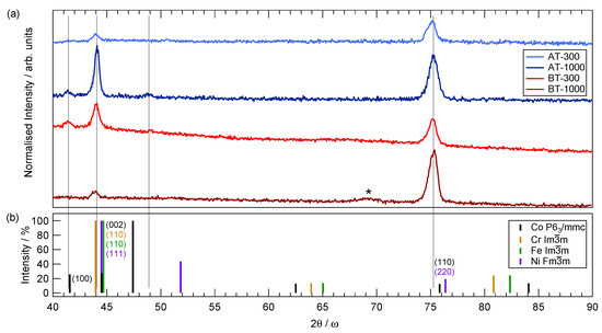 X-ray diffraction patterns obtained from the thin films are shown in Figure 6a. The diffraction pattern labelled AT-300 shows data taken from the film grown on the EN 1.4404 stainless-steel substrate after scaling and subtraction of the substrate diffraction pattern taken in advance. The curves AT-1000, BT-1000 and BT-300 represent data from the thin films deposited on Si(100) substrates. To eliminate the influence of the very intense Si(400) reflection at , an offset angle for was chosen and the measurements were performed in geometry with . It is noted that a weak Si(400) signal, marked by an asterisk, is still visible for BT-1000. Two peaks can be found in each of the diffraction patterns at and with varying intensity ratio. In comparison with the expectations of the underlying pure element data shown in Figure 6b, those signals are identified as the (111) and (220) planes of an fcc lattice similar to the shown Ni signal. The diffraction angles under which the signals show up is very close to those of the Alloytarget where a single-phase fcc structure was identified, and similar values were reported for magnetron sputtered CoCrFeNi on silicon [26]. However, it can be seen that only the (111) and (220) orientation of this phase was measured in the sputtered HEA thin films, which indicates two preferential growth directions with respect to the surface plane. Samples AT-1000 and BT-300 do show a small signal at , which can be attributed to the hcp (100) plane of cobalt. Although signals of the Co hcp phase were observed in the XRD data of the Blendtarget as well, the Co(100) peak is not one of them. An additional weak signal can be found around in sample AT-1000 that cannot be explained with similarities to the pure element structures. A wider angular range was measured but did not show further peaks.