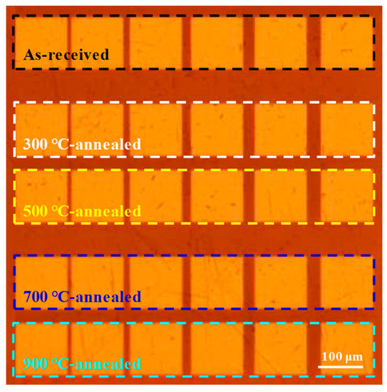 Figure 1 shows the surface morphology of five-group TLM patterns of Ni on the H-diamond epitaxial layer before annealing. The length and width of each electrode are the same as 100 μm. All the Ni metals were stable to be formed on the H-diamond. The five groups of TLM patterns were used to characterize current–voltage curves for the Ni/H-diamonds of as-received, 300 °C-annealed, 500 °C-annealed, 700 °C-annealed, and 900 °C-annealed, respectively. The interspace (d) values from left to right in Figure 1, between the two adjacent electrodes for the five-group TLM patterns, are in the ranges of 7.9–9.1 μm, 13.5–13.9 μm, 18.0–18.8 μm, 23.1–23.9 μm and 28.2–29.1 μm, respectively.