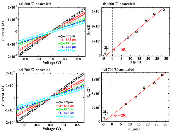 (a,c) Current–voltage characteristics of the 500 °C-annealed and 700 °C-annealed Ni/H-diamonds, respectively. (b,d) RT as functions of d for the 500 °C-annealed and 700 °C-annealed Ni/H-diamonds, respectively.