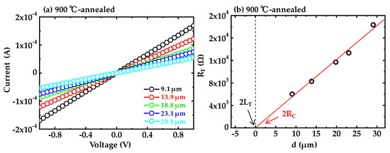 Figure 3a shows the current–voltage characteristics of the Ni/H-diamond after annealing at 500 °C. All the current–voltage curves have linear characteristics, which implies good ohmic contacts for the Ni/H-diamond. For two adjacent electrodes in which d = 8.7 μm, the output currents are 2.0 × 10−4 A at ±1.0 V. The total resistance (RT) for the 500 °C-annealed Ni/H-diamond can be calculated to be 4.9 × 103 Ω (d = 8.7 μm). Based on the current–voltage characteristics for other adjacent electrodes (Figure 3a), the RT for the Ni/H-diamond with other d values is also calculated and summarized in Figure 3b. There are the following relationships for the RT and ρC with the Ni/H-diamond contact resistance (RC), H-diamond surface sheet resistance (RS), electrode transfer length (LT), and electrode width (W) [18]:
