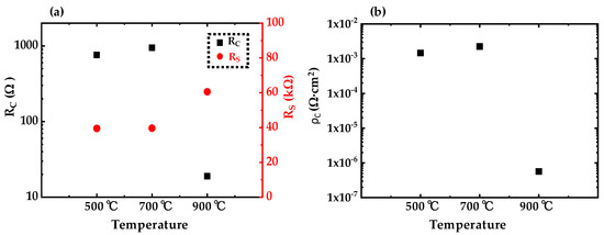 Figure 5a,b compare the RC, RS and ρC of the Ni/H-diamonds after annealing at 500, 700, and 900 °C, respectively. After annealing at 500 and 700 °C, the RC and RS values of the Ni/H-diamonds show no obvious changes. After annealing at 900 °C, however, the RC decreases to 19.0 Ω, while the RS increases to 60.6 kΩ. The increased RS is possibly attributed to the damage of C–H bonds or the desorbed absorption layer on the H-diamond surface after multiplied high-temperature treatments [5]. The decrease in RC may be due to the carbon phase transition at the interface between Ni and H-diamond at high temperatures [24,25]. Under the catalysis of nickel, diamond is prone to transform into the graphite phase or form carbide related with Ni, which greatly increases the electrical conductivity, thereby greatly reducing the contact resistance at the interface.